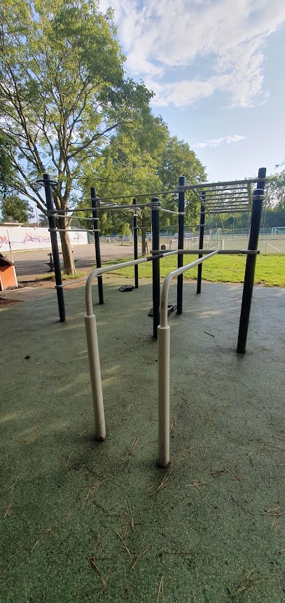Expérience fantastique: Parc complet avec l'éternel pont de singe, barre à dips, quelques prises neutres, des parallèttes ancré au sol et différentes hauteur de barre pour s'entraîner aux tractions. Lieux agréable au milieu des arbres et on peut profiter de l'éclairage du terrain de foot jusqu'à tard. Je recommande !