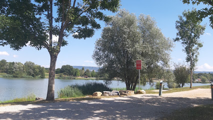 Expérience positive: Hier kann man gut Pause machen und sich im See erfrischen. Parkplatz, Bäume, Kiosk, Toiletten und Außenduschen.