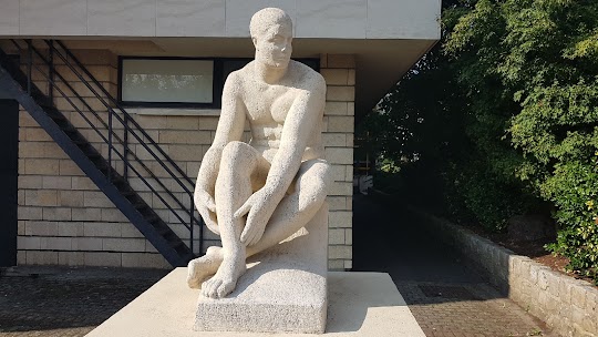 Expérience fantastique: Plaque en pierre avec portrait en relief de Pierre de Coubertin ( 1863-1937 ). Oeuvre de Jean Joachim, 1967. Pierre de Frédy, Baron de Coubertin, historien et pédagogue français, fondateur du Comité International Olympique et des Jeux Olympiques de l’ère moderne. ------ Statue Athlète au repos : Statue en pierre d'un homme nu assis. Oeuvre de Louis Dejean, 1950.